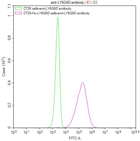 Untransfected CT26 cells surface (green line) and transfected Human LY6G6D CT26 stable cells surface (red line) were stained with anti-LY6G6D antibody (2μg/1*106cells), washed and then followed by FITC-conjugated anti-Mouse IgG Fc antibody and analyzed with flow cytometry.