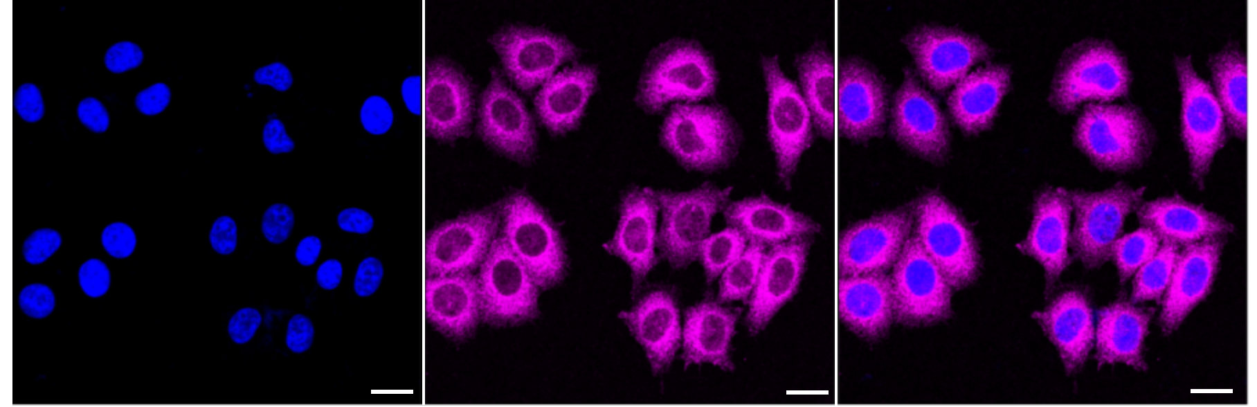 Immunocytochemical staining of HepG2 cells with MAP2K2 antibody. Nuclei were stained blue with DAPI; MAP2K2 was stained magenta with Alexa Fluor? 647. Images were taken using leica stellaris 5. Protein abundance based on laser intensity and smart gain: Medium. Scale bar: 20 μm.