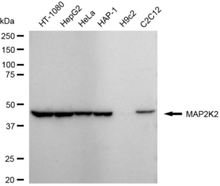 Western blotting analysis using MAP2K2 antibody. Total cell lysates (30 μg) from various cell lines were loaded and separated by SDS-PAGE. The blot was incubated with MAP2K2 antibody and HRP-conjugated goat anti-rabbit secondary antibody respectively.