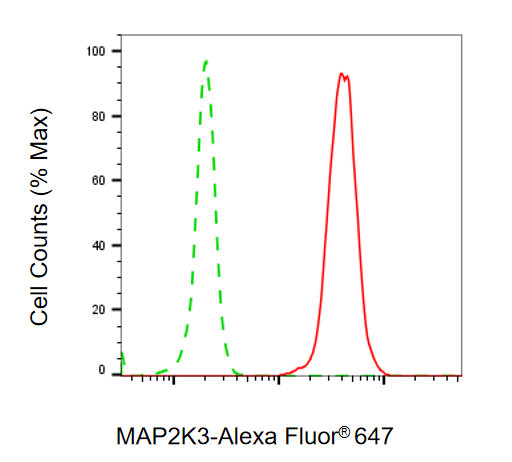 Flow cytometric analysis of MAP2K3 expression in C2C12 cells using MAP2K3 antibody. Green, isotype control; red, MAP2K3.