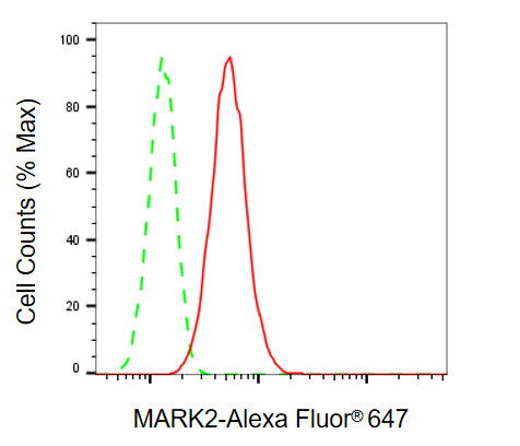Flow cytometric analysis of MARK2 expression in HT-1080 cells using MARK2 antibody. Green, isotype control; red, MARK2.