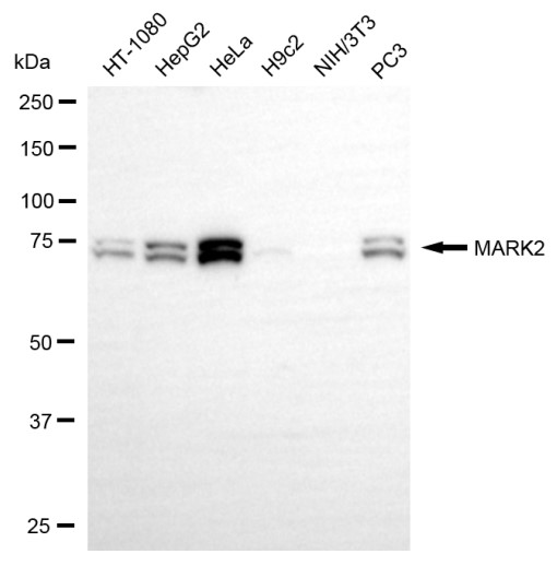 Western blotting analysis using MARK2 antibody. Total cell lysates (30 μg) from various cell lines were loaded and separated by SDS-PAGE. The blot was incubated with MARK2 antibody and HRP-conjugated goat anti-rabbit secondary antibody respectively.