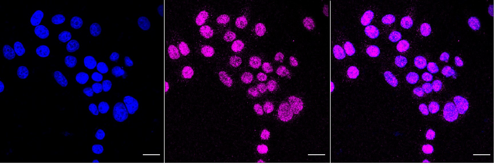 Immunocytochemical staining of HepG2 cells with MCM3 antibody. Nuclei were stained blue with DAPI; MCM3 was stained magenta with Alexa Fluor? 647. Images were taken using Leica stellaris 5. Protein abundance based on laser Intensity and smart gain: Medium. Scale bar, 20 μm.