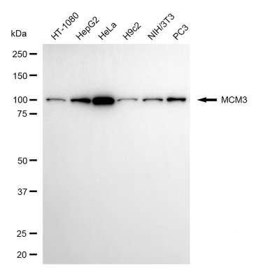 Western blotting analysis using MCM3 antibody. Total cell lysates (30 μg) from various cell lines were loaded and separated by SDS-PAGE. The blot was incubated with MCM3 antibody and HRP-conjugated goat anti-rabbit secondary antibody respectively.