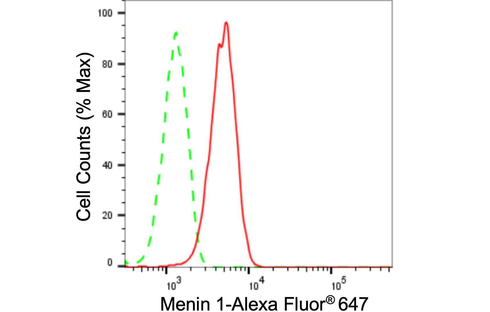 Flow cytometric analysis of Menin 1 expression in HepG2 cells using Menin 1 antibody. Green, isotype control; red, Menin 1.