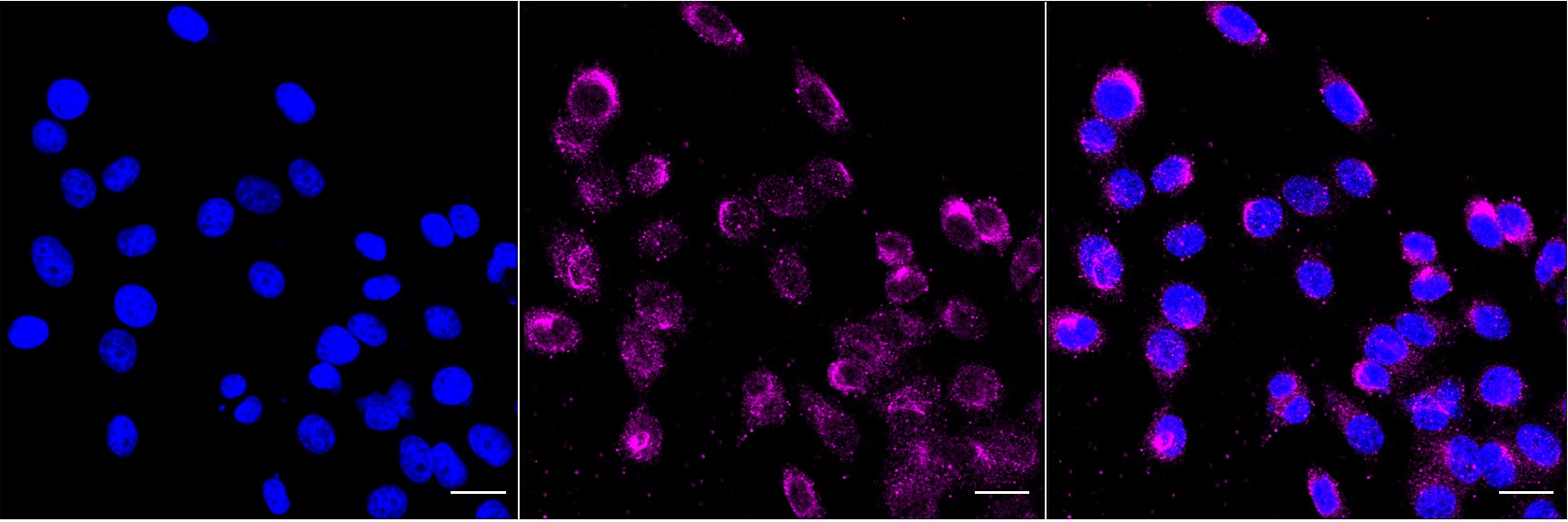 Immunocytochemical staining of HepG2 cells with Methionyl aminopeptidase 2 antibody. Nuclei were stained blue with DAPI; Methionyl aminopeptidase 2 was stained magenta with Alexa Fluor? 647. Images were taken using Leica stellaris 5. Protein abundance based on laser Intensity and smart gain: Medium. Scale bar, 20 μm.