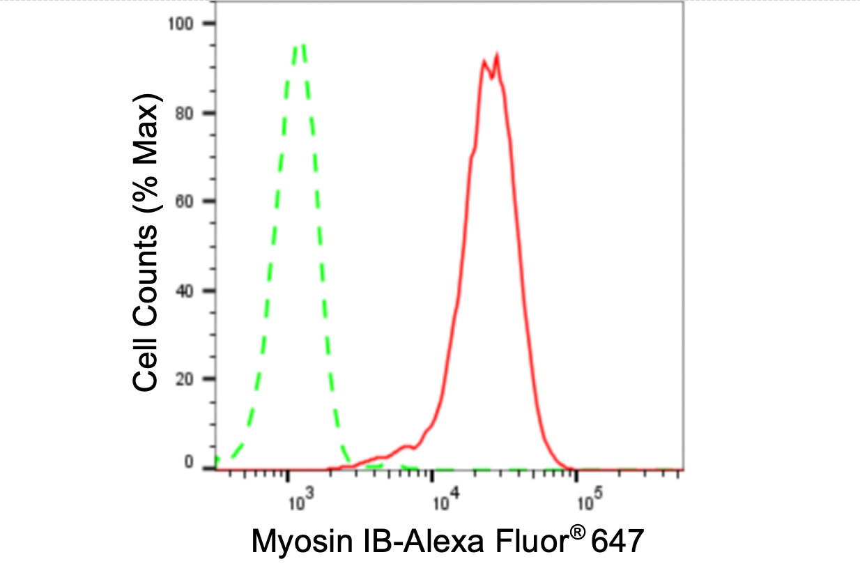 Flow cytometric analysis of Myosin IB expression in HepG2 cells using Myosin IBc antibody. Green, isotype control; red, Myosin IB.