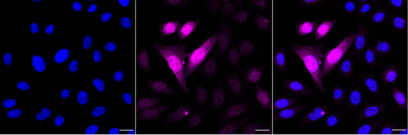 Immunocytochemical staining of HepG2 cells with Phospho-NDRG1 (Ser330) antibody. Nuclei were stained blue with DAPI; Phospho-NDRG1 (Ser330) was stained magenta with Alexa Fluor? 647. Images were taken using Leica stellaris 5. Protein abundance based on laser Intensity and smart gain: Medium. Scale bar, 20 μm.