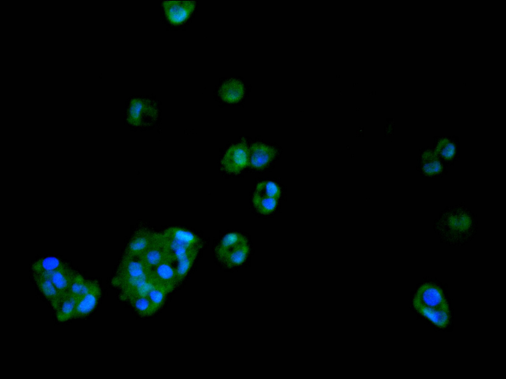 • Immunofluorescence staining of HepG2 cell with CSB-RA437145A0HU at 1:50, counter-stained with DAPI. The cells were fixed in 4% formaldehyde, permeabilized using 0.2% Triton X-100 and blocked in 10% normal Goat Serum. The cells were then incubated with the antibody overnight at 4°C. The secondary antibody was Alexa Fluor 488-congugated AffiniPure Goat Anti-Rabbit IgG(H+L).