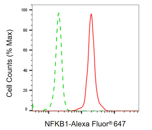 Flow cytometric analysis of NFKB1 expression in C2C12 cells using NFKB1 antibody. Green, isotype control; red, NFKB1.