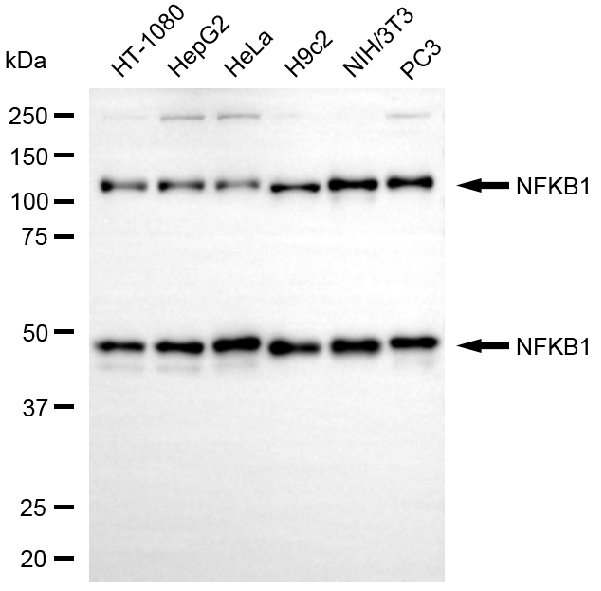 Western blotting analysis using NFKB1 antibody. Total cell lysates (30 μg) from various cell lines were loaded and separated by SDS-PAGE. The blot was incubated with NFKB1 antibody and HRP-conjugated goat anti-rabbit secondary antibody respectively.
