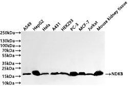 Positive WB detected in: A549 whole cell lysate(30μg), HepG2 whole cell lysate(30μg), HeLa whole cell lysate(30μg), A431 whole cell lysate(30μg), HEK293 whole cell lysate(30μg), PC-3 whole cell lysate(30μg), MCF-7 whole cell lysate(30μg), Jurkat whole cell lysate(30μg), Mouse kidney tissue lysate(30μg)