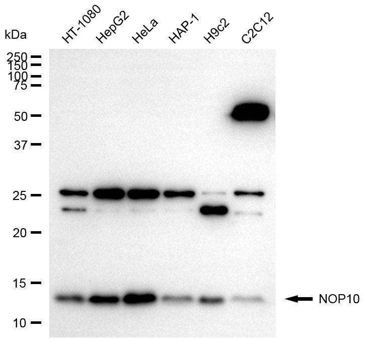 Western blotting analysis using NOP10 antibody. Total cell lysates (30 μg) from various cell lines were loaded and separated by SDS-PAGE. The blot was incubated with NOP10 antibody and HRP-conjugated goat anti-rabbit secondary antibody respectively.