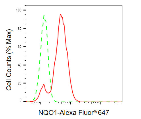 Flow cytometric analysis of NQO1 expression in HT-1080 cells using NQO1 antibody. Green, isotype control; red, NQO1.