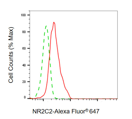Flow cytometric analysis of NR2C2 expression in HepG2 cells using NR2C2 antibody. Green, isotype control; red, NR2C2.