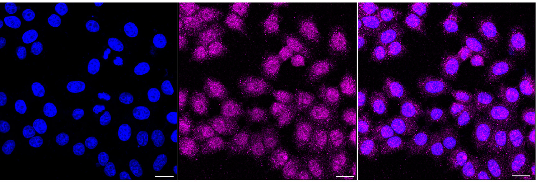 Immunocytochemical staining of HepG2 cells with NR2C2 antibody. Nuclei were stained blue with DAPI; NR2C2 was stained magenta with Alexa Fluor? 647. Images were taken using Leica stellaris 5. Protein abundance based on laser Intensity and smart gain: Medium. Scale bar, 20 μm.