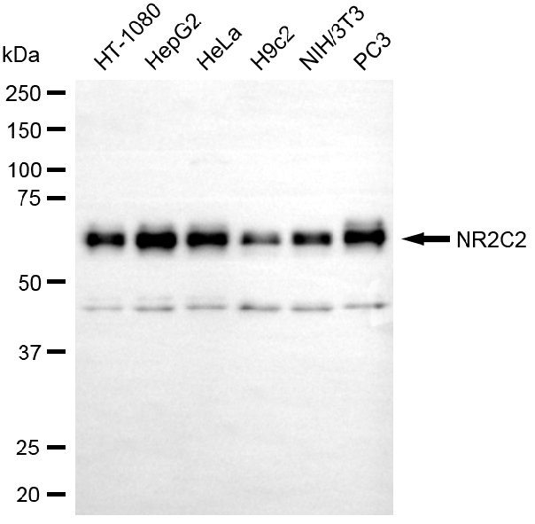 Western blotting analysis using NR2C2 antibody. Total cell lysates (30 μg) from various cell lines were loaded and separated by SDS-PAGE. The blot was incubated with NR2C2 antibody and HRP-conjugated goat anti-rabbit secondary antibody respectively.