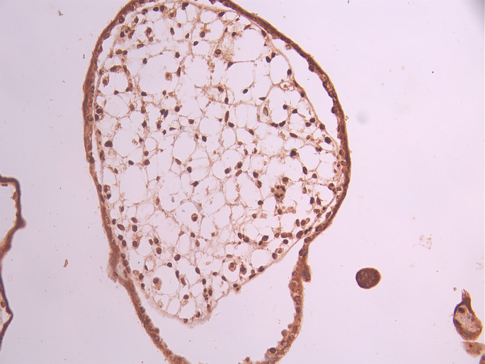 IHC image of CSB-RA168797A0HU diluted at 1:100 and staining in paraffin-embedded human placenta tissue performed on a Leica BondTM system. After dewaxing and hydration, antigen retrieval was mediated by high pressure in a citrate buffer (pH 6.0). Section was blocked with 10% normal goat serum 30min at RT. Then primary antibody (1% BSA) was incubated at 4°C overnight. The primary is detected by a Goat anti-rabbit polymer IgG labeled by HRP and visualized using 0.05% DAB.