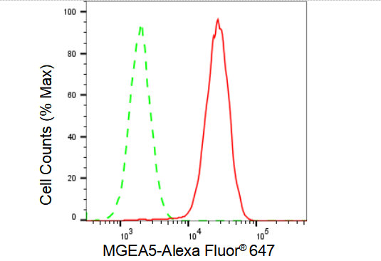 Flow cytometric analysis of MGEA5 expression in HAP-1 cells using MGEA5 antibody. Green, isotype control; red, MGEA5.