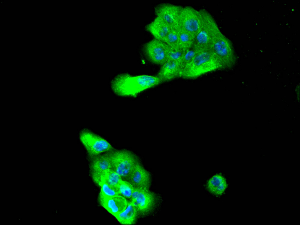 Immunofluorescence staining of A431 cell with CSB-RA785472A0HU at 1:50, counter-stained with DAPI. The cells were fixed in 4% formaldehyde, permeabilized using 0.2% Triton X-100 and blocked in 10% normal Goat Serum. The cells were then incubated with the antibody overnight at 4°C. The secondary antibody was Alexa Fluor 488-congugated AffiniPure Goat Anti-Rabbit IgG(H+L).