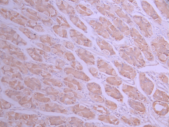 IHC image of CSB-RA785472A0HU diluted at 1:100 and staining in paraffin-embedded human stomach tissue performed on a Leica BondTM system. After dewaxing and hydration, antigen retrieval was mediated by high pressure in a citrate buffer (pH 6.0). Section was blocked with 10% normal goat serum 30min at RT. Then primary antibody (1% BSA) was incubated at 4°C overnight. The primary is detected by a Goat anti-rabbit polymer IgG labeled by HRP and visualized using 0.05% DAB.