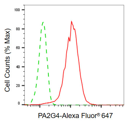 Flow cytometric analysis of PA2G4 expression in HepG2 cells using PA2G4 antibody. Green, isotype control; red, PA2G4.