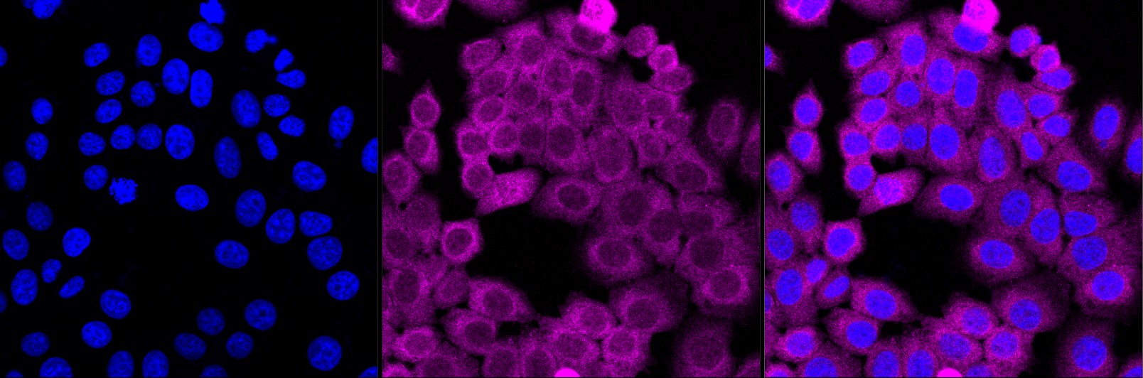 Immunocytochemical staining of HepG2 cells with PA2G4 antibody. Nuclei were stained blue with DAPI; PA2G4 was stained magenta with Alexa Fluor? 647. Images were taken using Leica stellaris 5. Protein abundance based on laser Intensity and smart gain: Medium. Scale bar, 20 μm.