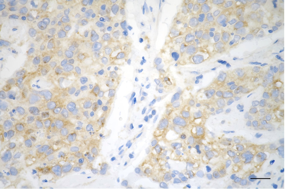 Immunohistochemistry was performed on paraffin-embedded human breast carcinoma using PA2G4 antibody. Antigen retrieval was done in sodium citrate buffer (pH 6.0). DAB was used for detection, with hematoxylin counterstaining. Images were acquired using a Nikon Ci-L Plus microscope (40× objective). Scale bar: 25 μm.