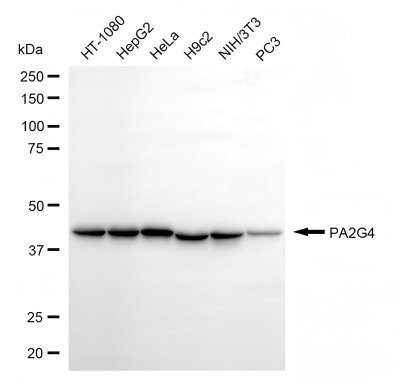 Western blotting analysis using PA2G4 antibody. Total cell lysates (30 μg) from various cell lines were loaded and separated by SDS-PAGE. The blot was incubated with PA2G4 antibody and HRP-conjugated goat anti-rabbit secondary antibody respectively.
