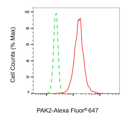 Flow cytometric analysis of PAK2 expression in HT-1080 cells using PAK2 antibody. Green, isotype control; red, PAK2.