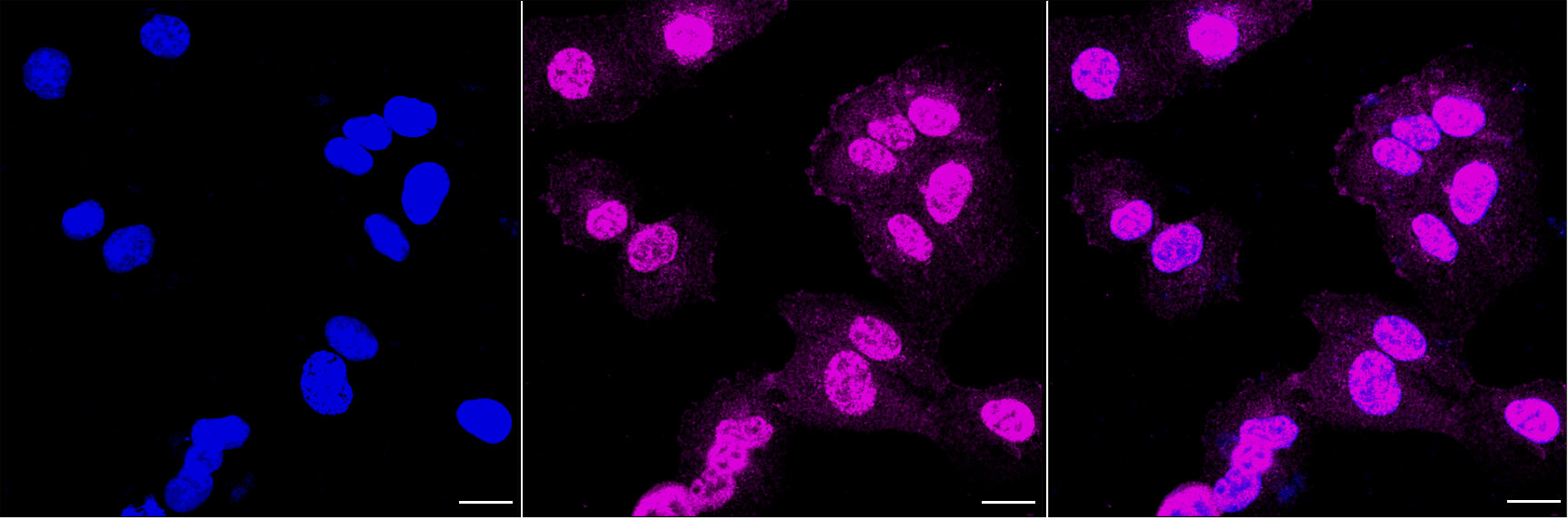 Immunocytochemical staining of HT-1080 cells with PAK2 antibody. Nuclei were stained blue with DAPI; PAK2 was stained magenta with Alexa Fluor? 647. Images were taken using Leica stellaris 5. Protein abundance based on laser Intensity and smart gain: High. Scale bar, 20 μm.