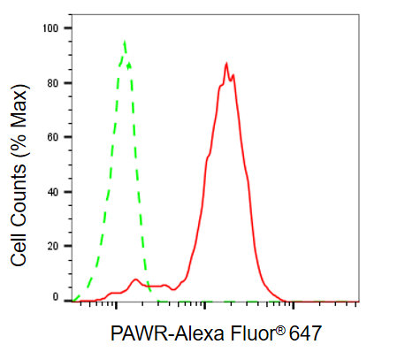 Flow cytometric analysis of PAWR expression in HepG2 cells using PAWR antibody. Green, isotype control; red, PAWR.