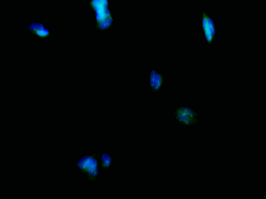 Immunofluorescence staining of SH-SY5Y cell with CSB-RA287871A0HU at 1:50 , counter-stained with DAPI. The cells were fixed in 4% formaldehyde, permeabilized using 0.2% Triton X-100 and blocked in 10% normal Goat Serum. The cells were then incubated with the antibody overnight at 4°C. The secondary antibody was Alexa Fluor 488-congugated AffiniPure Goat Anti-Rabbit IgG(H+L).