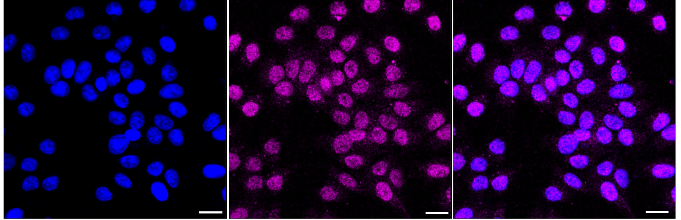 Immunocytochemical staining of HepG2 cells with PDIA4 antibody. Nuclei were stained blue with DAPI; PDIA4 was stained magenta with Alexa Fluor廬 647. Images were taken using leica stellaris 5. Protein abundance based on laser intensity and smart gain: Medium. Scale bar: 20 渭m.