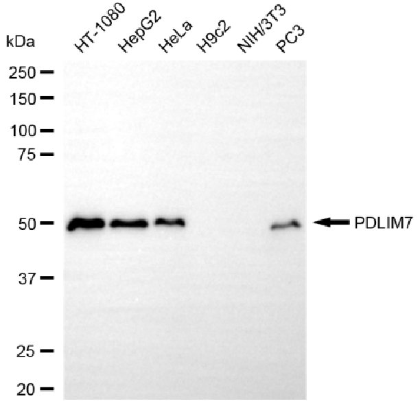 Western blotting analysis using PDLIM7 antibody. Total cell lysates (30 μg) from various cell lines were loaded and separated by SDS-PAGE. The blot was incubated with PDLIM7 antibody and HRP-conjugated goat anti-mouse secondary antibody respectively.