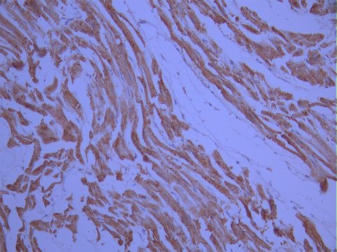 IHC image of CSB-RA212222A0HU diluted at 1:100 and staining in paraffin-embedded human heart tissue performed on a Leica BondTM system. After dewaxing and hydration, antigen retrieval was mediated by high pressure in a citrate buffer (pH 6.0). Section was blocked with 10% normal goat serum 30min at RT. Then primary antibody (1% BSA) was incubated at 4°C overnight. The primary is detected by a Goat anti-rabbit polymer IgG labeled by HRP and visualized using 0.05% DAB.