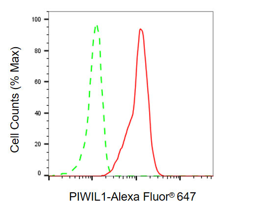 Flow cytometric analysis of PIWIL1 expression in HT-1080 cells using PIWIL1 antibody. Green, isotype control; red, PIWIL1.