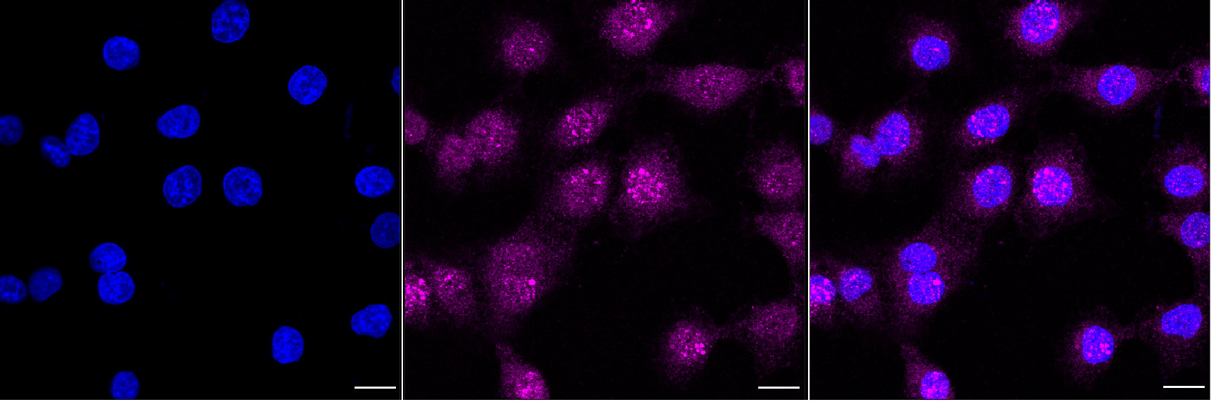 Immunocytochemical staining of HT-1080 cells with PIWIL1 antibody. Nuclei were stained blue with DAPI; PIWIL1 was stained magenta with Alexa Fluor? 647. Images were taken using Leica stellaris 5. Protein abundance based on laser Intensity and smart gain: Medium. Scale bar, 20 μm.