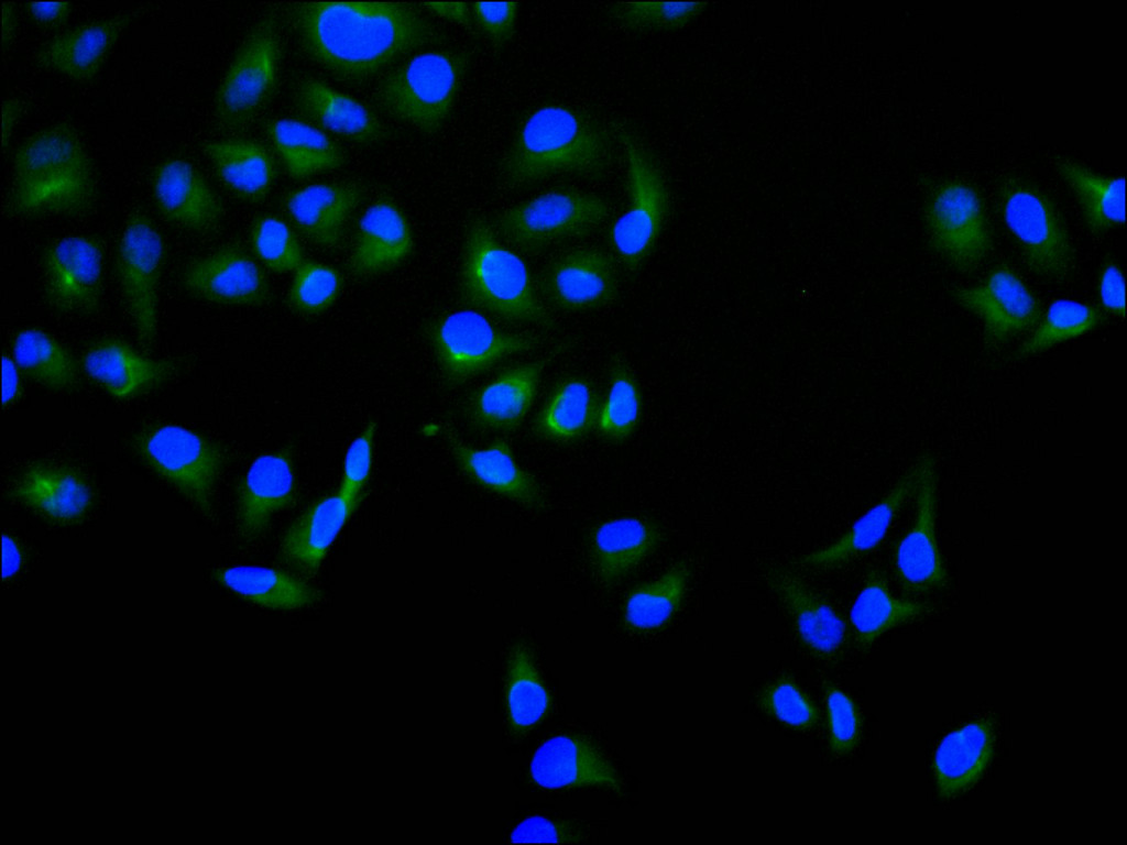 Immunofluorescence staining of Hela cell with CSB-RA028490A0HU at 1:50 , counter-stained with DAPI. The cells were fixed in 4% formaldehyde, permeabilized using 0.2% Triton X-100 and blocked in 10% normal Goat Serum. The cells were then incubated with the antibody overnight at 4°C. The secondary antibody was Alexa Fluor 488-congugated AffiniPure Goat Anti-Rabbit IgG(H+L).