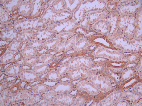 IHC image of CSB-RA632615A0HU diluted at 1:100 and staining in paraffin-embedded human kidney tissue performed on a Leica BondTM system. After dewaxing and hydration, antigen retrieval was mediated by high pressure in a citrate buffer (pH 6.0). Section was blocked with 10% normal goat serum 30min at RT. Then primary antibody (1% BSA) was incubated at 4°C overnight. The primary is detected by a Goat anti-rabbit polymer IgG labeled by HRP and visualized using 0.05% DAB.