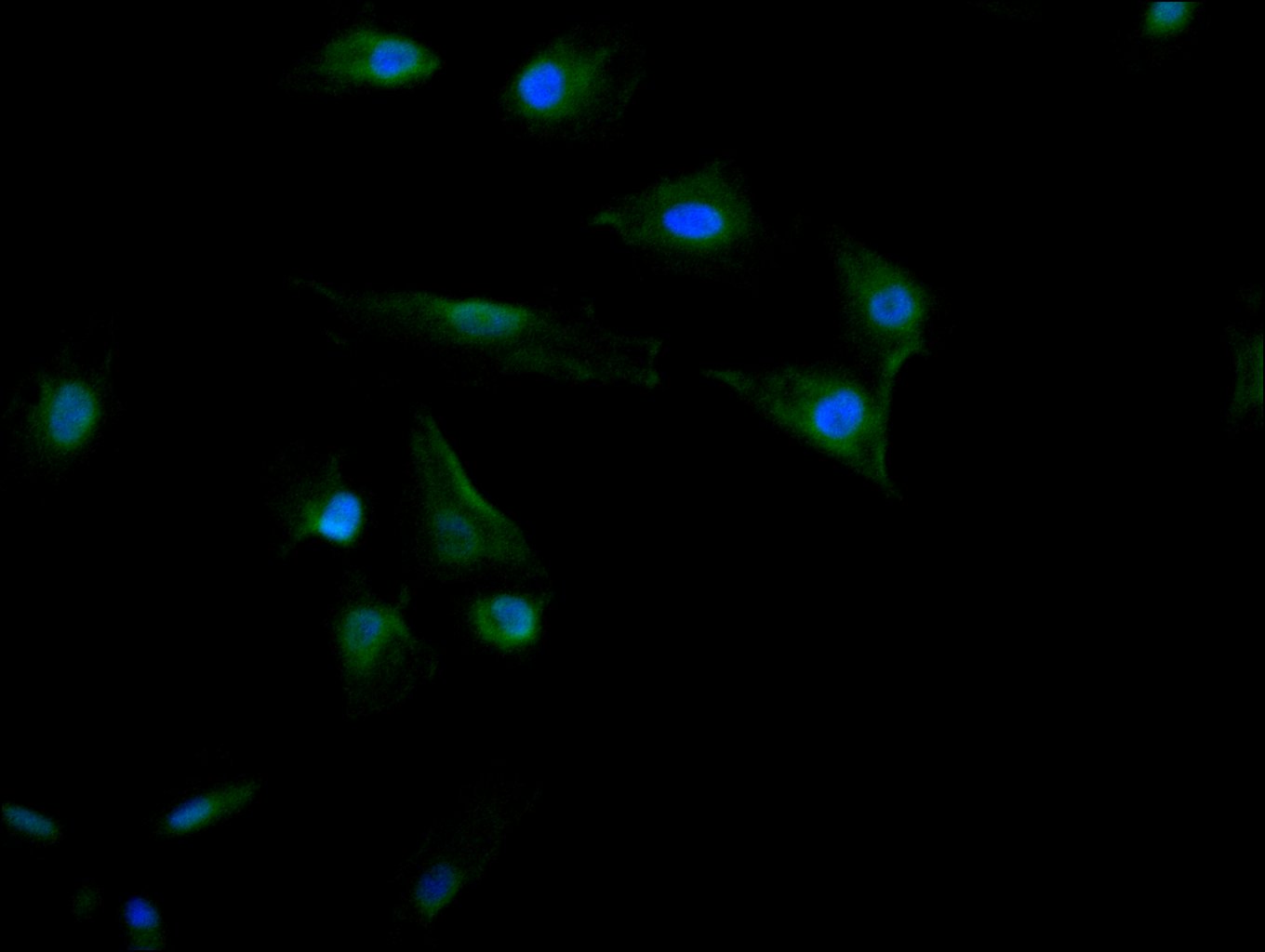 Immunofluorescence staining of A-549 cell with CSB-RA171352A0HU at 1:50, counter-stained with DAPI. The cells were fixed in 4% formaldehyde, permeabilized using 0.2% Triton X-100 and blocked in 10% normal Goat Serum. The cells were then incubated with the antibody overnight at 4°C. The secondary antibody was Alexa Fluor 488-congugated AffiniPure Goat Anti-Rabbit IgG(H+L).