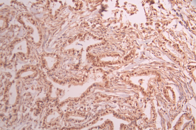 IHC image of CSB-RA171352A0HU diluted at 1:100 and staining in paraffin-embedded human cervical cancer performed on a Leica BondTM system. After dewaxing and hydration, antigen retrieval was mediated by high pressure in a citrate buffer (pH 6.0). Section was blocked with 10% normal goat serum 30min at RT. Then primary antibody (1% BSA) was incubated at 4°C overnight. The primary is detected by a Goat anti-rabbit polymer IgG labeled by HRP and visualized using 0.05% DAB.