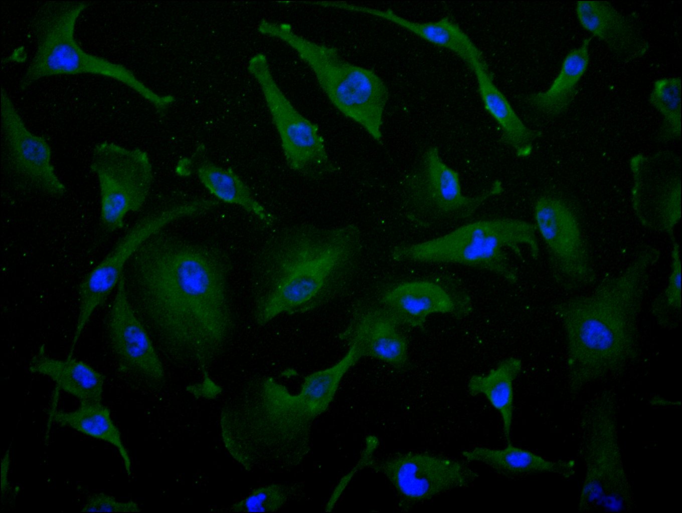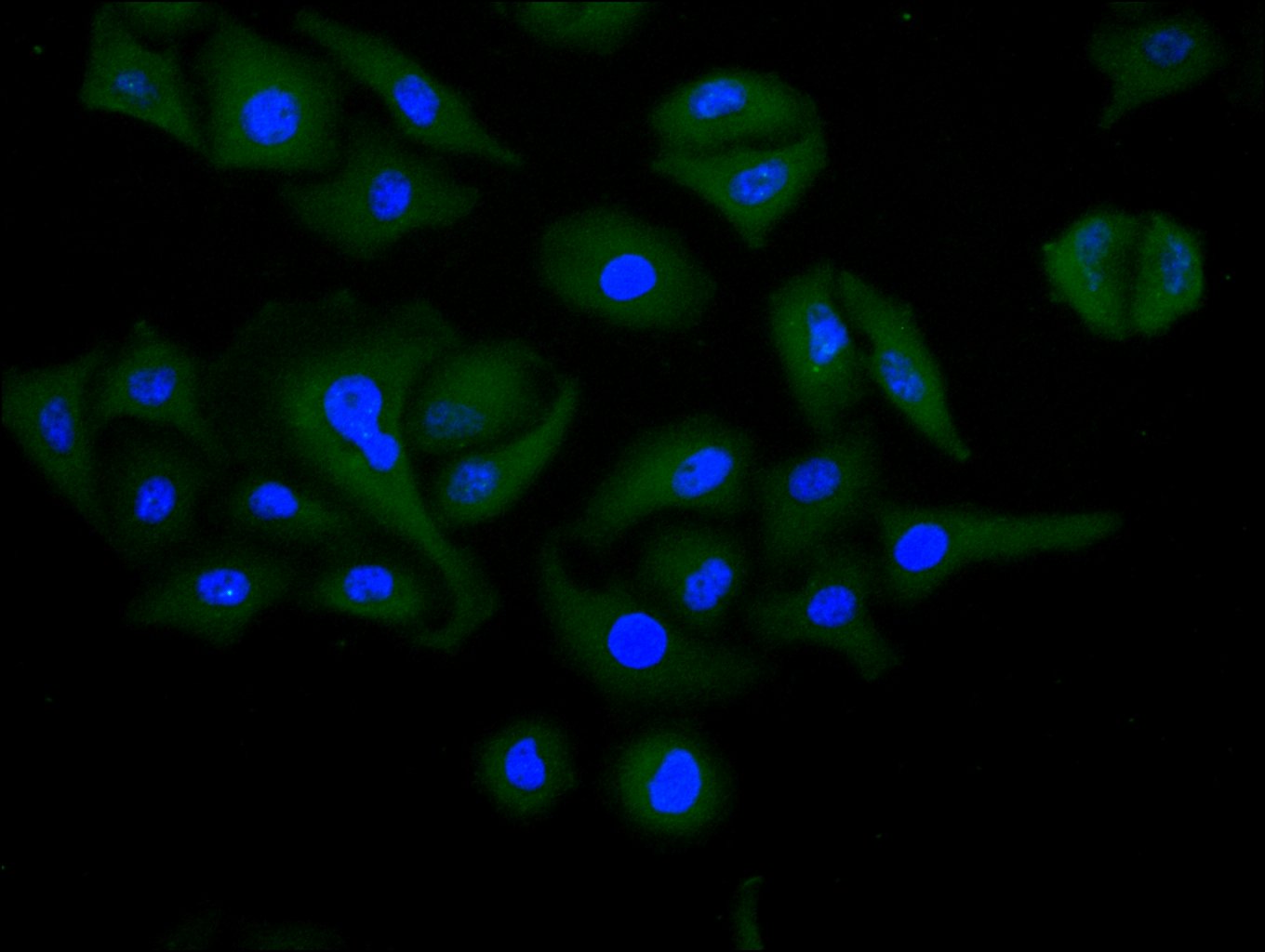 Immunofluorescence staining of U251 cell with CSB-RA619962MA1HU at 1:30 ,counter-stained with DAPI. The cells were fixed in 4% formaldehyde, permeabilized using 0.2% Triton X-100 and blocked in 10% normal Goat Serum. The cells were then incubated with the antibody overnight at 4°C. The secondary antibody was Fluorescein (FITC) AffiniPure Goat Anti-Human IgG, Fcγ fragment specific.
