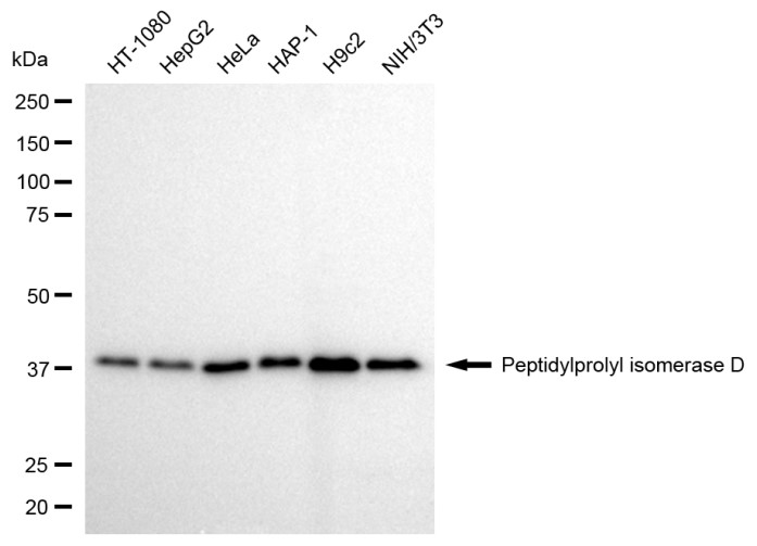 Western blotting analysis using peptidylprolyl isomerase D antibody. Total cell lysates (30 μg) from various cell lines were loaded and separated by SDS-PAGE. The blot was incubated with peptidylprolyl isomerase D antibody and HRP-conjugated goat anti-rabbit secondary antibody respectively.