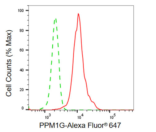 Flow cytometric analysis of PPM1G expression in HepG2 cells using PPM1G antibody. Green, isotype control; red, PPM1G.