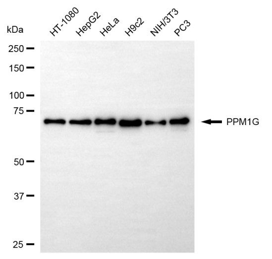 Western blotting analysis using PPM1G antibody. Total cell lysates (30 μg) from various cell lines were loaded and separated by SDS-PAGE. The blot was incubated with PPM1G antibody and HRP-conjugated goat anti-rabbit secondary antibody respectively.