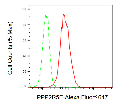 Flow cytometric analysis of PPP2R5E expression in HepG2 cells using PPP2R5E antibody. Green, isotype control; red, PPP2R5E.