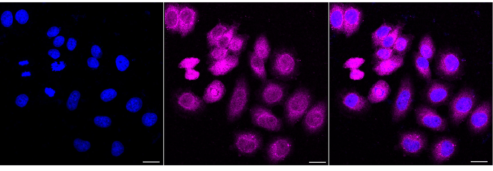 Immunocytochemical staining of HepG2 cells with PPP2R5E antibody. Nuclei were stained blue with DAPI; PPP2R5E was stained magenta with Alexa Fluor? 647. Images were taken using Leica stellaris 5. Protein abundance based on laser Intensity and smart gain: Medium. Scale bar, 20 μm.