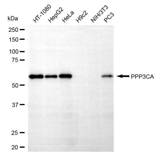 Western blotting analysis using PPP3CA antibody. Total cell lysates (30 μg) from various cell lines were loaded and separated by SDS-PAGE. The blot was incubated with PPP3CA antibody and HRP-conjugated goat anti-rabbit secondary antibody respectively.