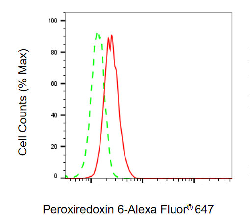 Flow cytometric analysis of Peroxiredoxin 6 expression in HepG2 cells using Peroxiredoxin 6 antibody. Green, isotype control; red, Peroxiredoxin 6.